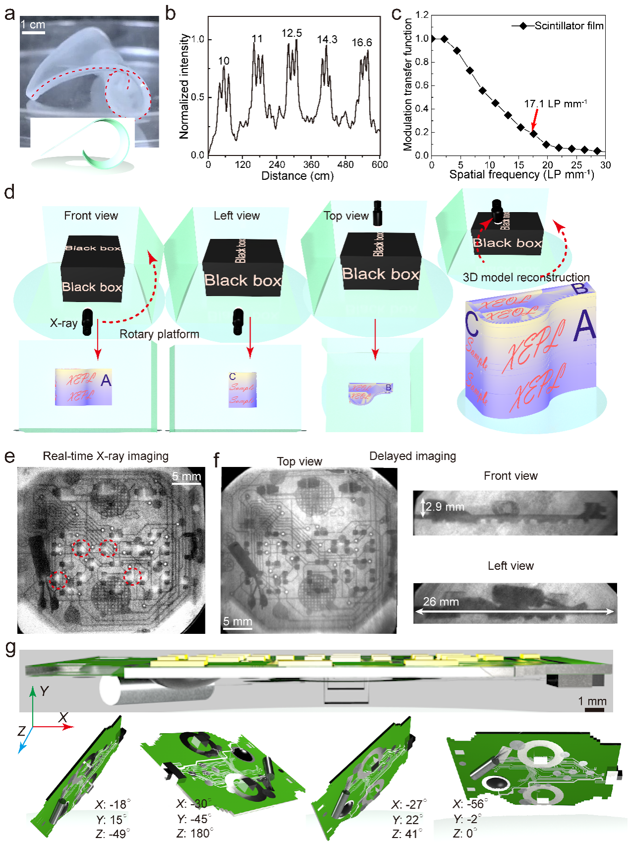 团队还研制出基于Y@Lu/Gd/Tb@Y纳米晶的柔性薄膜X射线探测器件,弯曲幅度接近180度,拉伸幅度大于200%, 在300-800 nm范围内的光透过率大于 90%。采用自主搭建的X射线成像系统,在调制传递函数(MTF)值为0.2时的空间分辨率约为17.1 LP mm-1,优于多数报道的卤化物钙钛矿(通常低于10 LP mm-1),与商用CsI (Tl)闪烁体 (≈10 LP mm-1)。在无热激励且辐射剂量率为4.5 µGy s-1的条件下, 双异质核壳纳米晶的延时X射线成像质量明显优于核纳米晶体系。进一步结合图像重构技术,实现了电子器件的三维成像(图1)。