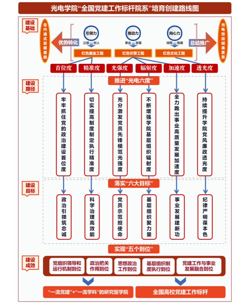 下一步,学院党委将以“三大工程”为基础,以“光电六度”为建设路径,落实“六大目标”,实现“五个到位”,将学院党委建设成为政治引领筑忠诚、科学治理高效能、党员示范担使命、基层组织聚力量、纪律严明葆本色、事业发展建新功的全国高校党建标杆院系,为学院和学校高质量发展提供坚强保证。
