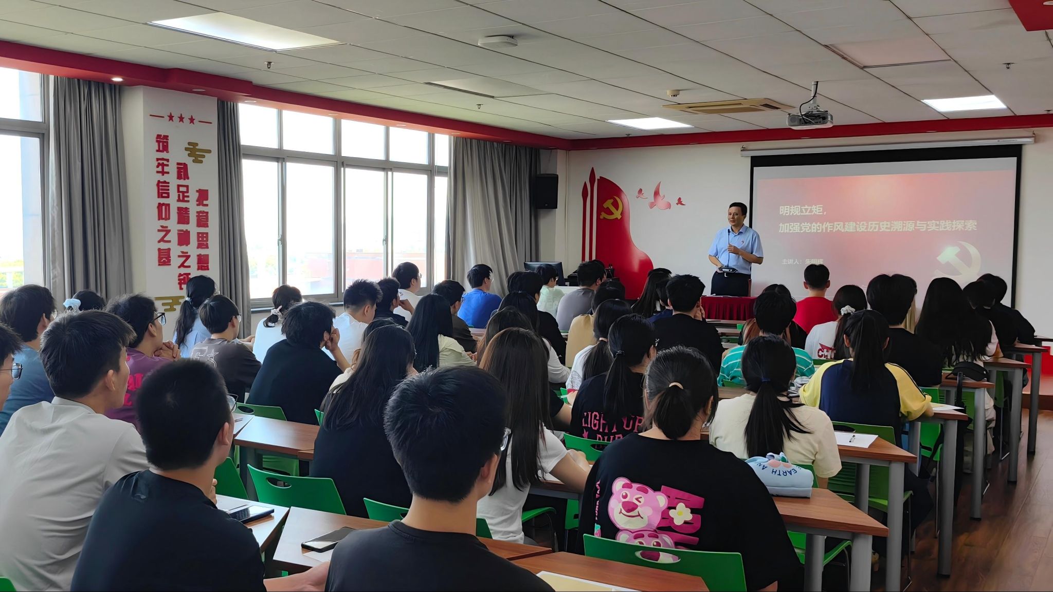 活动伊始,朱明辉代表学院党委对全体新发展党员表示祝贺,并讲授题为《明规立矩,加强党的作风建设历史溯源与实践探索》的专题党课。他从历史视角系统梳理了党在不同历史时期加强作风建设的探索与经验,深刻阐释了作风建设作为党的“传家宝”对于永葆党的先进性、纯洁性、凝聚力和战斗力的重要性;从理论视角领学《习近平关于加强党的作风建设论述摘编》,引导学生党员自觉用党的创新理论武装头脑、强化思想根基;从实践视角,结合“四风”问题在校园的潜在表现及反面典型案例,强调党员强化党性修养、弘扬优良作风的现实意义。朱明辉指出,作风建设是投身党的事业的“入场券”,更是青年党员必须深耕的“思想田”,要将纪律规矩内化于心、外化于行,在日常学习实践、恪守学术规范、服务同学需求中锤炼过硬作风,以优良党风引领院风学风,为学院高质量发展汇聚奋进力量。