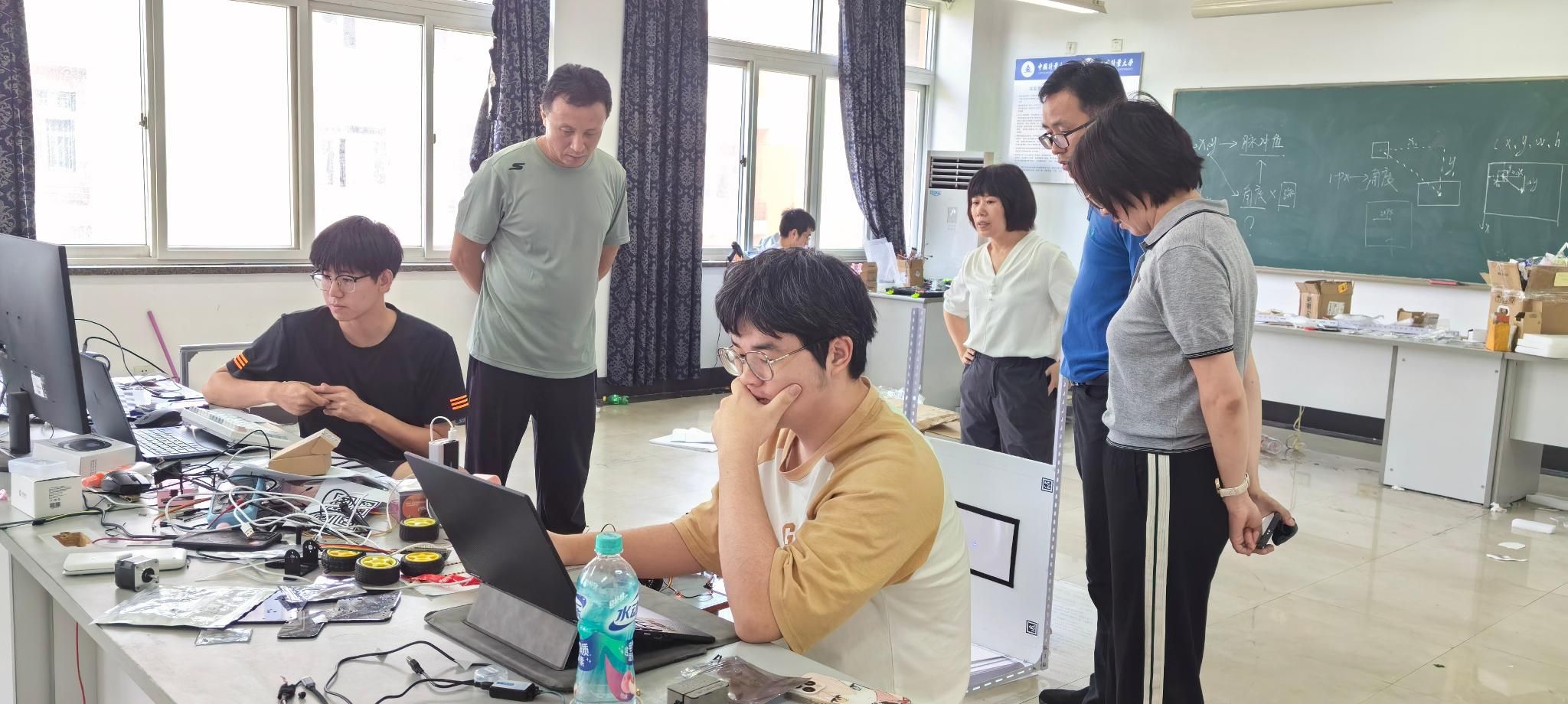 同日下午,院党委书记朱明辉、党委副书记方结红、副院长李晨霞、康娟一行来到光电设计竞赛实训基地,看望紧张备赛的师生团队。朱明辉详细了解训练进度、存在的困难及阶段性成果,对师生不畏酷暑、坚持备赛的精神给予高度肯定。他强调学院将全力支持竞赛工作,同时贴心提醒同学们在刻苦训练中务必注意操作安全、用电安全及个人健康,做到劳逸结合,保持最佳竞技状态的同时确保人身安全,力争在竞赛中再创佳绩。