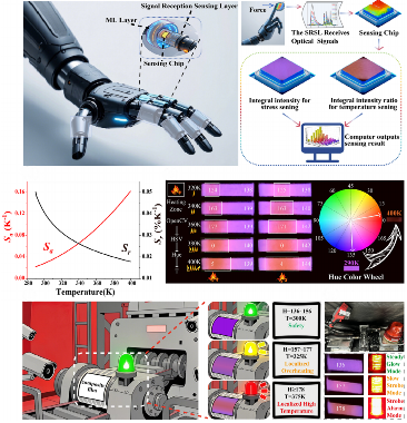 应力发光是无源智能传感的创新技术,但力与温度都会影响应力发光的光学性能,即存在交叉敏感问题,如何解耦力学信息和温度信息仍面临巨大挑战。基于此,团队报道了一种新型可控应力发光变色材料体系,研制出基于HSV色度分析的实时非接触式应力-温度双参量传感系统。利用自主研制的力-电-光同步检测分析仪器,深入揭示了该体系应力诱导摩擦电驱动发光机理,结合Eu2+,Sm3+共掺杂SrF2对力和温度不同的发光敏感性,通过创新机器学习视觉识别算法,在复杂力-温度条件下,成功实现双参量独立解耦,温度感知绝对灵敏度达到优异的0.162 K-1,解决了交叉敏感难题。最后,在模拟工业场景中验证了其实时非接触式应力-温度双参量监测能力,为应力发光智能传感技术在多物理场耦合环境中的多参量精确感知提供了新思路。