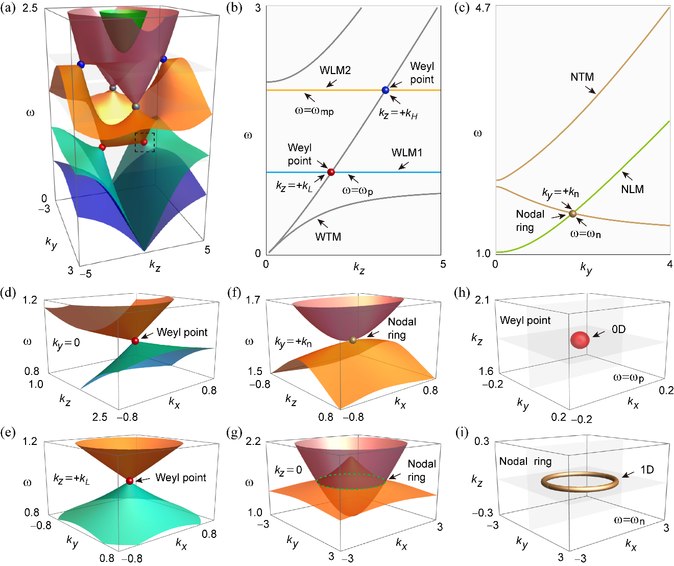 本工作证明了零维外尔点和一维节环在拓扑旋电连续介质中的共存性。通过解析理论分析,我们给出了连续介质中不同维度能带简并的拓扑相图,并阐释外尔点和节环能够共存的临界条件。其中,节环的尺寸在三维动量空间中随旋电参数的变化而变化,从而表明了磁场强度可看作是控制带简并度的一种自由度。当旋电连续介质与真空态直接接触时,由于体边界对应而产生拓扑保护的费米弧表面态。此外,利用单向费米弧表面态,实现了一种多通道传输信息的拓扑光子路由。本研究为研究外尔半金属和节线半金属之间的相互作用建立了一个灵活的框架,为多路复用光子拓扑器件的设计实现提供了理论参考。
