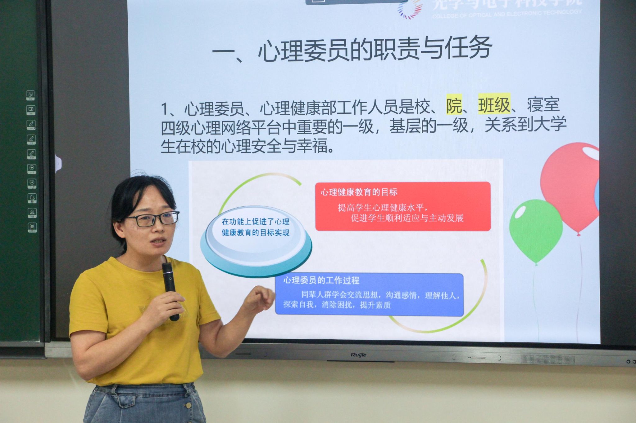 随后陈驹为25级心理委员和心理健康部全体新成员进行了岗前培训。她强调,心理委员和心理健康部工作人员是校、院、班级、寝室四级心理网络平台中重要的一级,工作充满挑战与意义,关系到大学生在校的心理健康与幸福。培训中她对心理委员、心理健康部工作人员的职责与任务、工作的方法与途径﹑必须具备的素质与要求进行了详细地介绍和讲解,并给25级心理委员和心理健康部全体新成员讲授了一些基本的心理常识,如何发现、辨别异常心理等。最后她希望所有的心理委员和心理健康部工作者要相互配合与协作,将自己对心理的热爱变成专业,将自己对同学的热心转化为行动,用积极乐观心态去支持和帮助身边的同学,发挥好自己的桥梁和陪伴作用,在收获自我成长的同时积极为班级、学院乃至学校的大学生心理健康工作作出自己的贡献,协助同学们培育积极的心理品质,提高心理健康素养。