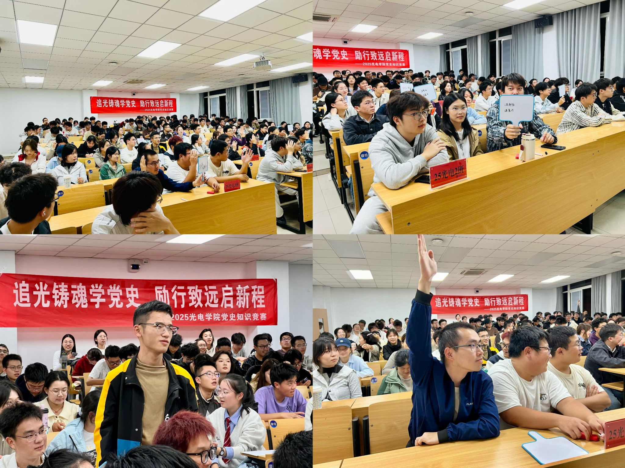 本次知识竞赛内容涵盖党的发展历程中的重大事件与重要人物,同时结合纪念抗战胜利80周年、学习贯彻党的二十届四中全会精神、弘扬科学家精神等时代主题,实现历史与现实交融,进一步激发了同学们的学习热情。比赛现场气氛紧张热烈,参赛选手思维敏捷、沉着应答,充分展现了光电学子昂扬的精神风貌。