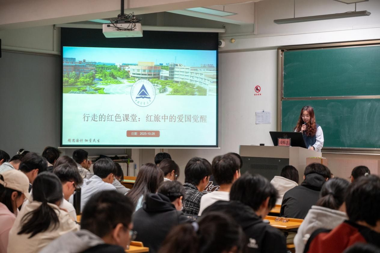 光学与电子科技学院的辅导员凌烁淇以“红旅中的爱国觉醒”为主题,通过国内多处红色旅游胜地的特色故事,结合她自身参观河南林州红旗渠的深刻体验,提到当代红色旅游已超越简单的“打卡”意义,成为培育爱国情怀的重要途径。她呼吁学子们将红色旅游转化为“行走的思政课”,在实地探访中感悟爱国精神真谛,将红色精神转化为日常学习的强大动力。