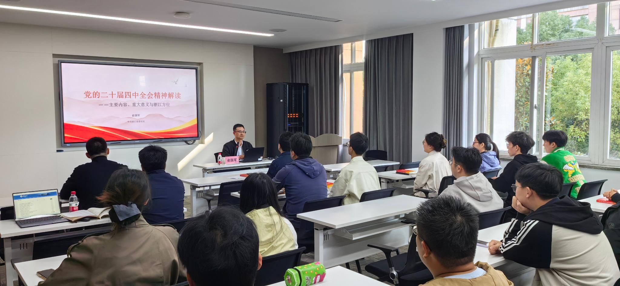会议特邀中共浙江省委党校浙江发展战略研究院教师、共同富裕研究中心副主任俞国军作专题辅导讲座。俞国军以“党的二十届四中全会精神解读——主要内容、重大意义与浙江方位”为题,系统梳理全会主要内容,结合数据分析、观点阐释与对比研究,深入解读“十五五”规划的战略意义与浙江发展的历史方位,对全会提出的一系列新概念、新观点、新论断进行了深入浅出的解析,帮助师生深化了对全会精神的理解和把握。