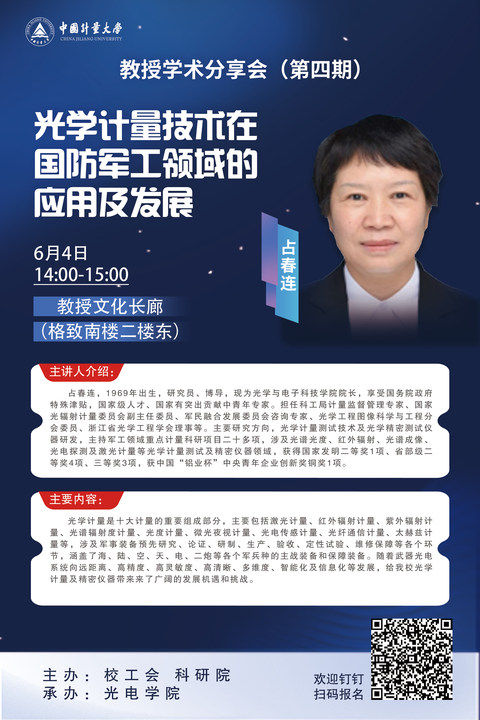 为营造浓厚的学术文化氛围,校工会、科研院联合光电学院推出教授学术分享会,邀请占春连教授开展学术分享与交流,近期即将开展第四期分享会,现将相关事项通知如下: